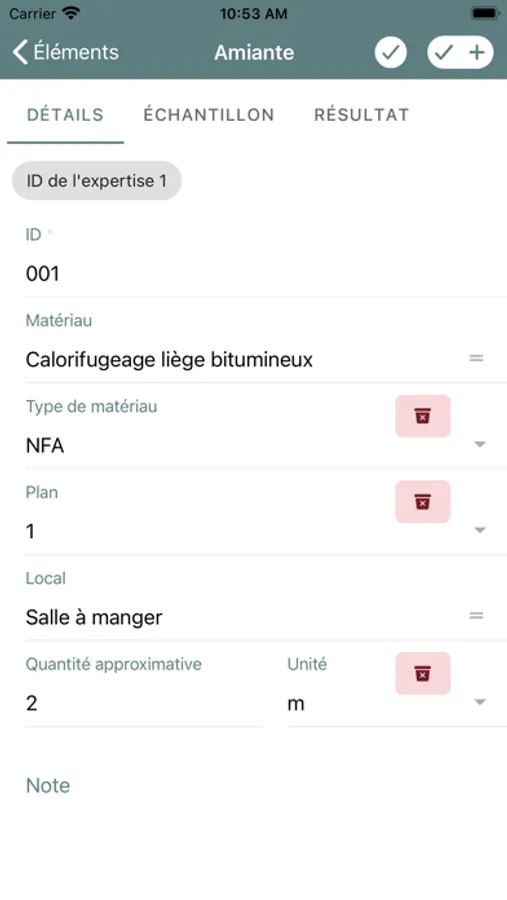 • Elements/Samples management (photos, characteristics and location on the plan)
