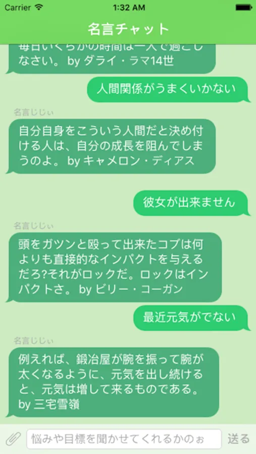 このアプリは、名言じじぃというキャラクターがあなたに最適な名言を送ってくれるサービスです。