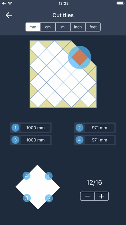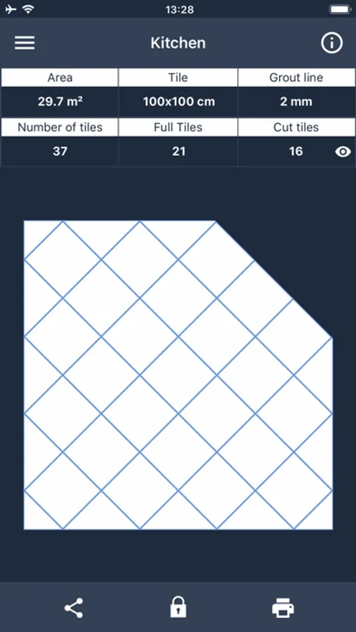 If you are satisfied with the positioning of the tiles, you can view the cut tiles with the dimensions. The total number of tiles and the number of cut tiles are also displayed.