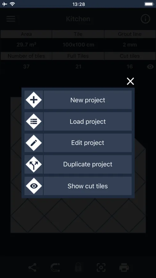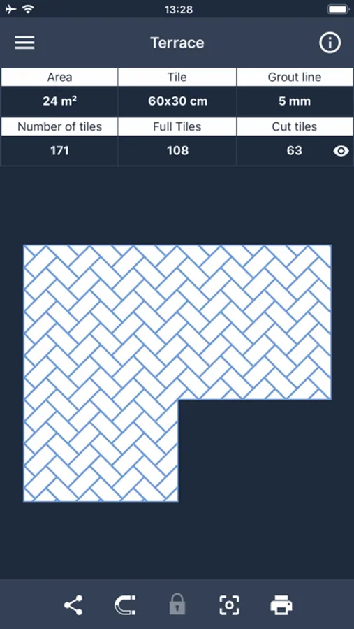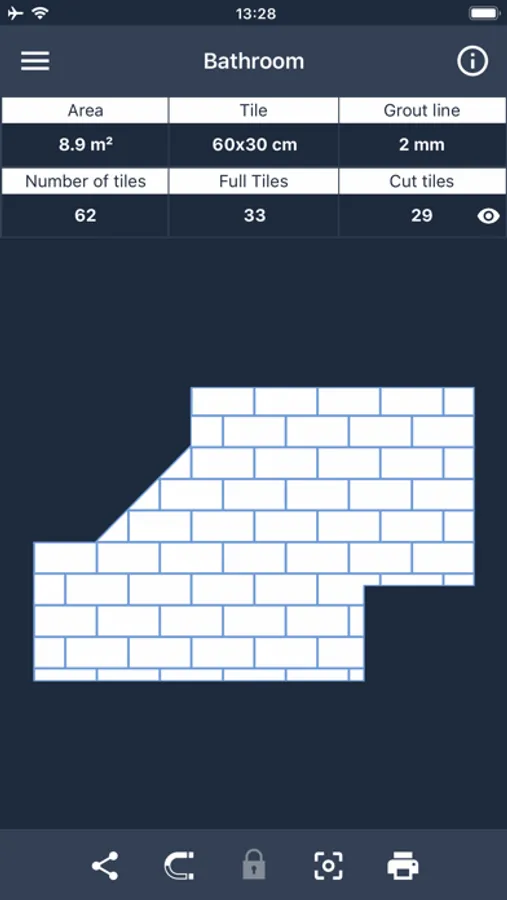 This app helps you to plan the laying of the tiles. After entering all necessary information, the area with the tiles will be displayed. The tiles can be moved within the area with your finger. This makes it possible to optimally place the tiles to avoid very narrowly cut tiles.