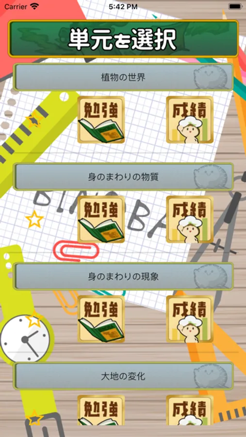 単元ごとの成績を棒グラフで確認できるので、自分の成長を実感できます。
