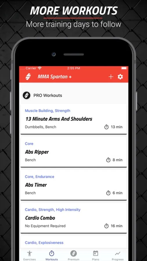 MMA Spartan System offers many different workout types (BBG, HIIT, high intensity, beginner, intermediate, advanced, etc.) each of which displays the intensity level of the workout.