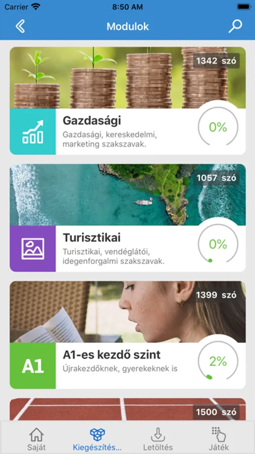 A program a nyelvtanulásnak legfárasztóbb, leghosszadalmasabb részében ad érezhetően nagy segítséget! A jelenleg támogatott angol nyelvvizsga szintek: A1 (1400 szó), A2 (1500 szó), B1 (1800 szó), B2 (1400 szó), gazdasági szakszavak (1300 szó), turisztikai szakszavak (1000 szó).