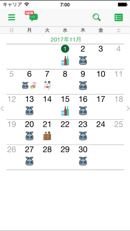 お住まいの地区を登録することで、ごみ収集日を一目で確認することができます。カレンダーは週ごとまたは月ごとで確認できます。