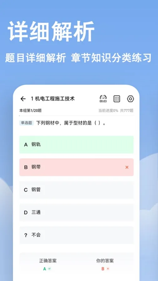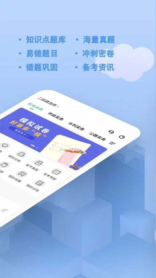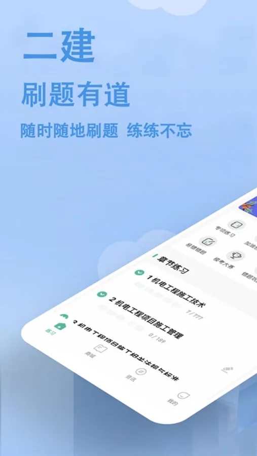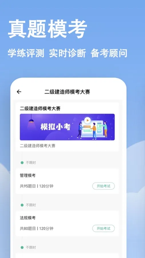 二级建造师考试题库是考生专用的实现科目练习和模拟考试的手机端APP软件,集智能辅导、详细解析、全真题库和考试考情于一身,涵盖该考试热点、难点和常考点,包含了《施工管理》、《工程法规》、《建筑工程》、《机电工程》、《市政工程》、《水利水电》、《公路工程》等科目的历年真题集模拟试题题型,二建师考试题库章节练习,解决二建考试备考刷题,包括题库中的试题全真模拟真实的考试,是各位考生学习备考的好帮手。