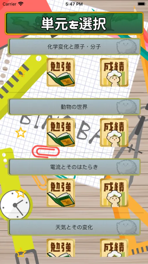 単元ごとの成績を棒グラフで確認できるので、自分の成長を実感できます。