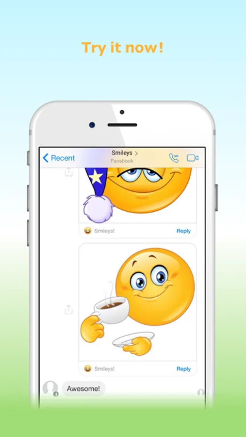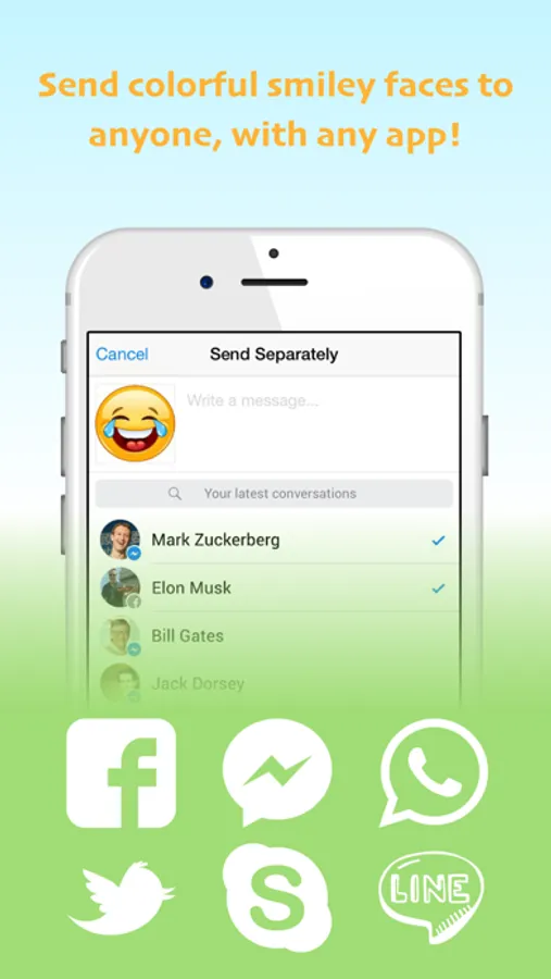 You can use your iPhone or iPad to quickly send smileys on Facebook or any other messenger. Nice and simple interface allows you to share your thoughts instantly, everywhere, with just 3 taps! Select any emoticon, choose where to post, tap on “Send”. That’s all!