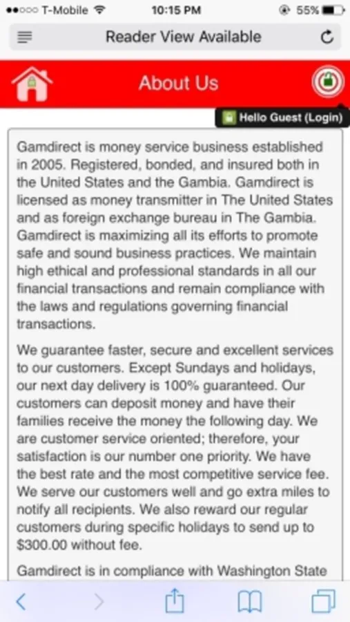 At Gamdirect, we guarantee faster, secure and excellent services to our customers. Except Sundays and holidays, our next day delivery is 100% guaranteed. Our customers can deposit money and have their families receive the money the following day. We are customer service oriented; therefore, your satisfaction is our number one priority. We have the best rate and the most competitive service fee. We serve our customers well and go extra miles to notify all recipients. We also reward our regular customers during specific holidays to send up to $300.00 without fee. You can use our easy-to-use money transfer mobile app to transfer money swiftly and securely. For feedback and any questions, please contact us at: Tel: +1 800 846-7066 Tel: +1 206 335-8800 Email: info@gamdirectllc.com