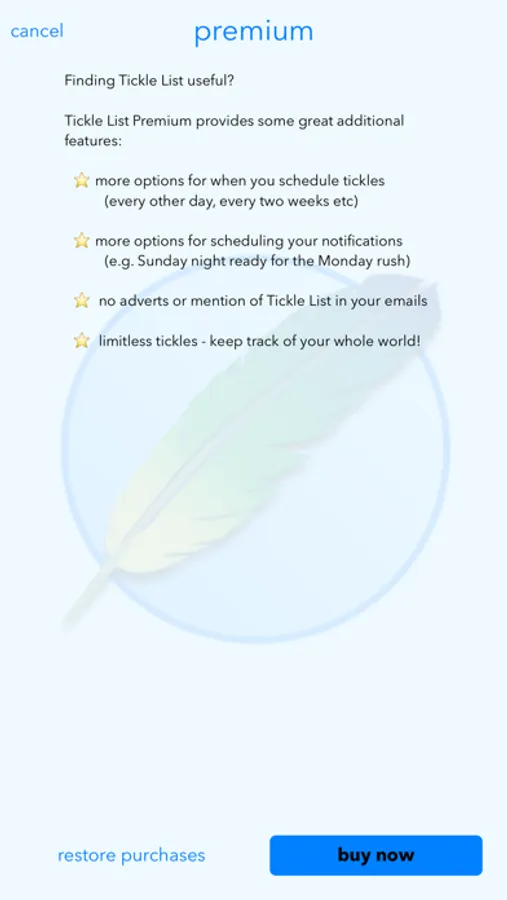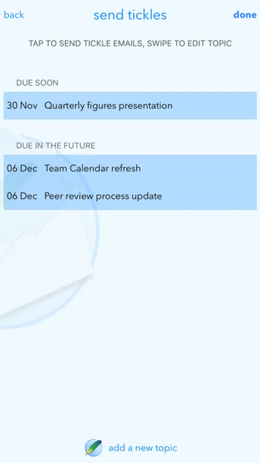 Tickle List is free to use for up to 5 tasks. An inexpensive in-app purchase allows unlimited tasks, and more options for how often to chase your team, and for when you get notifications - including every 1,2,3,4 Working Days, Quarterly, Bi-Annually etc.