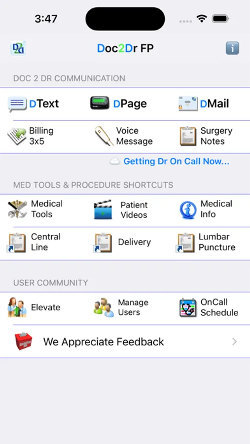 I’m an ObGyn who teaches Family Practice Residents Obstetrics, so our 3rd specialty version of FP was a natural. This version introduces Patient Videos - over 40 short 3-5minute videos of repetitive counseling to save you time - just show them the QR code, and they watch on their phone! This version update has better access of your on call status on device or from the web. Share with hospitalists, nurses, and staff so you can be reached or helped when unavailable. Elevate now shows who's out, so you know who to remind or "Elevate" when you see them miss updates on their patients - this is the best way to improve the local quality of care with group feedback. For Texting, there is built in safety to ensure your message gets read, easy access to anyone at your hospital On Call, and medically tailored messaging. Texting labels with patient's name. QuickText responses. Just like regular texting, with added Medical Intelligence. This really simplifies weekend patient sign out/Handoff. In addition, Doc2Dr's powerful automatic OpNotes will virtually eliminate wasted time on repetitive dictations - we do 95% of the work for you. It's fully customizable to match your particular operative style, and even handles voice dictations when you have a complex case not amenable to templates. Just like regular texting, with added Medical Intelligence. There are also tools and pertinent reference info tailored to Family Medicine, with the ability for you to grow and customize this list.