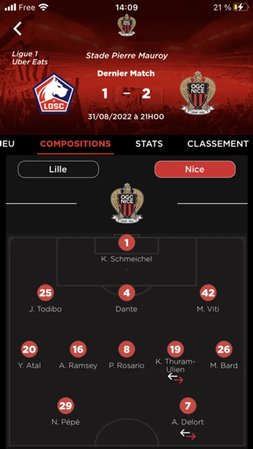 • Nouveau match center avec des statistiques en direct, une meilleure intégration des commentaires de match, tweets et photos, un système de notifications (score, buts), les autres résultats de L1 en live.