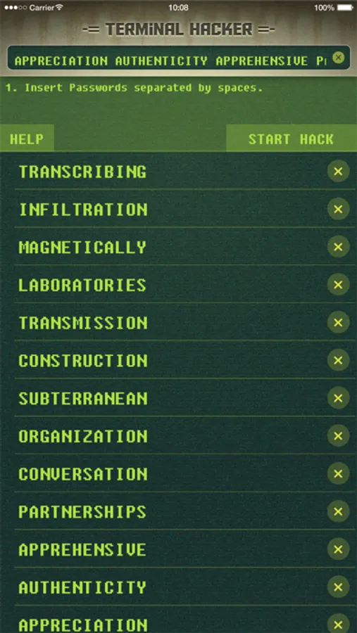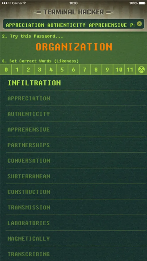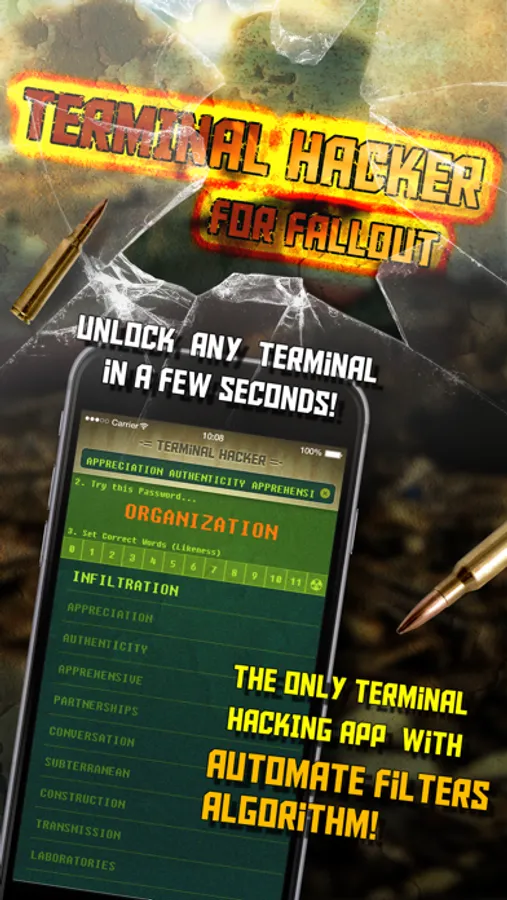 What sets Terminal Hacker for Fallout apart from similar apps is its unique Auto-Filtering algorithm. While other apps let you choose any password and then analyze the data, Terminal Hacker automatically performs a first analysis to detect recognizable patterns and select the most probable words first. In short, while other apps require four attempts to hack a terminal, Terminal Hacker usually hacks a terminal in just half the time (and often, in just one step!)
