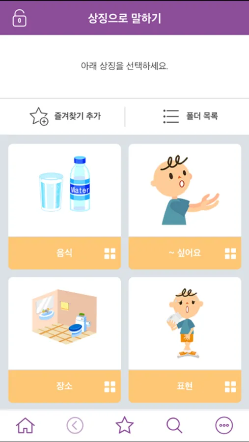 음식, 장소, 표현 등으로 구분된 폴더에서 원하는 상징을 선택해 만든 문장으로 의사소통 할 수 있는 기능