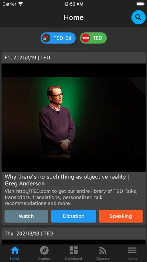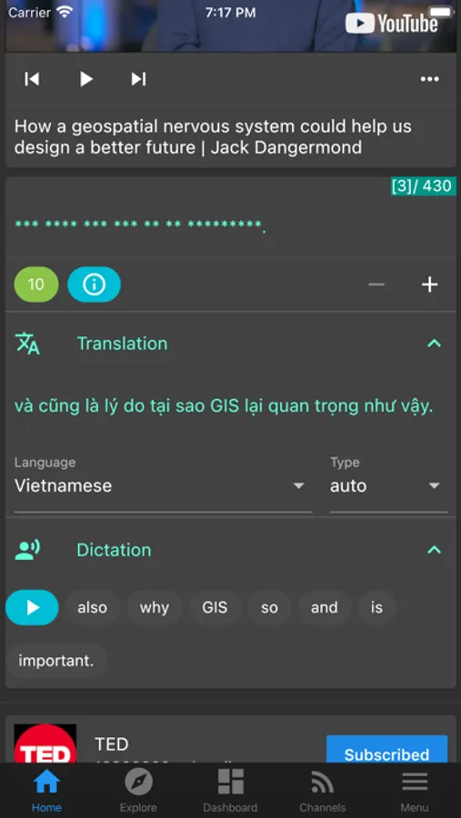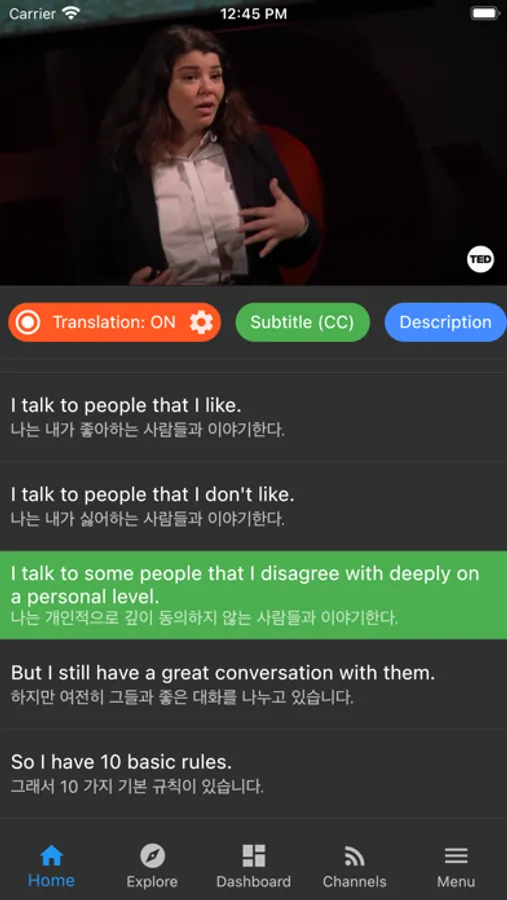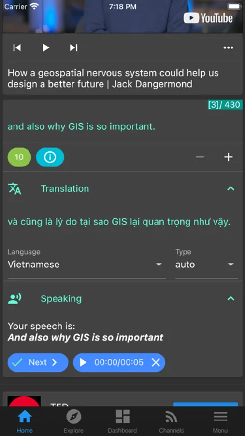 - Translation: Users don't have to open dictionary to check new vocabularies. They can see the side-by-side translations along with subtitle while doing dictation and speaking. This app supports more than 60 translated languages.