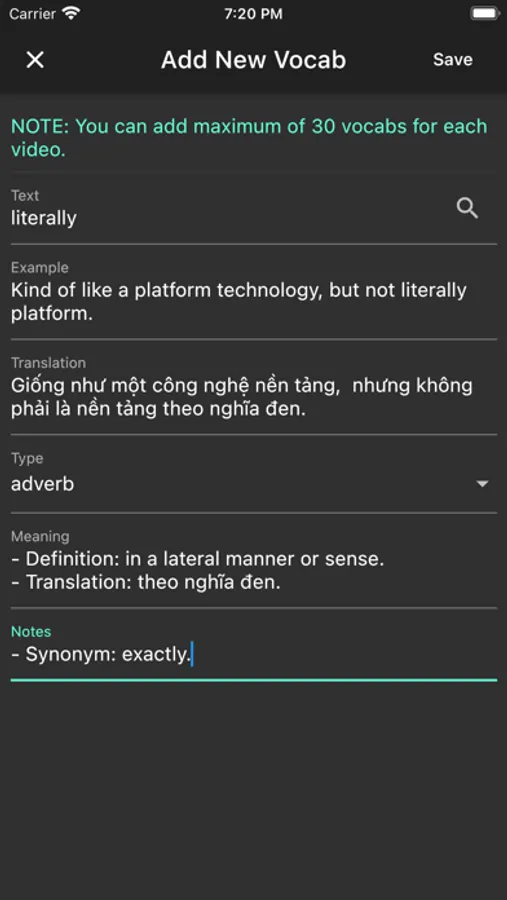 - Vocabularies and exercisers: users can take notes of new words (vocabulary, phrase etc.) while doing dictation and speaking, and do exercises with their vocabularies.