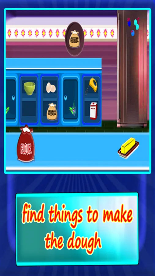 → Kitchen puzzle: Find cutlery & crockery items like flour, sugar, blender, butter, eggs & bowl from kitchen cabinets.