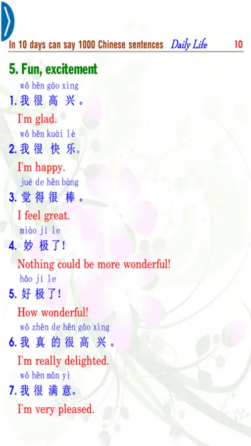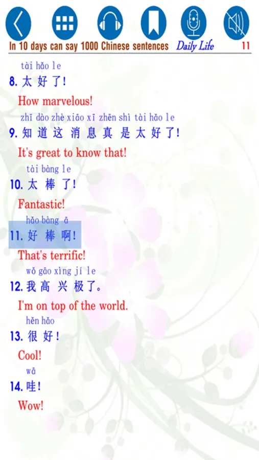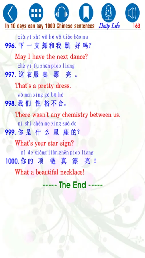 The book "In 10 days can say 1000 Chinese Sentences – Daily Life (10 天会说1000 汉语句 - 日常生活)” includes 163 pages which are compiled according to the purpose "Learn Chinese anytime, anywhere ". Integrated - audio books (audio) mark each sentence, so when you read or listen to a sentence and want to listen again, you only need to touch the sentence and the sound of sentence will be played again; SmartBooks also has the feature of recording your voice (your voice reading the learning sentence) by clicking the icon Micro (icon Recorder), when you click on the icon Headphone (listen and write - listening and writing), screen appears with a lot of features to help you listen and write the sentence heard by key or by hand,... This is our breakthrough advance in the age of technology and it will help you a lot in learning language and reading conveniently.