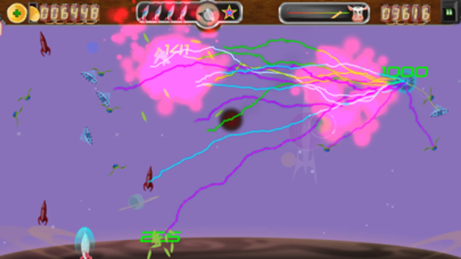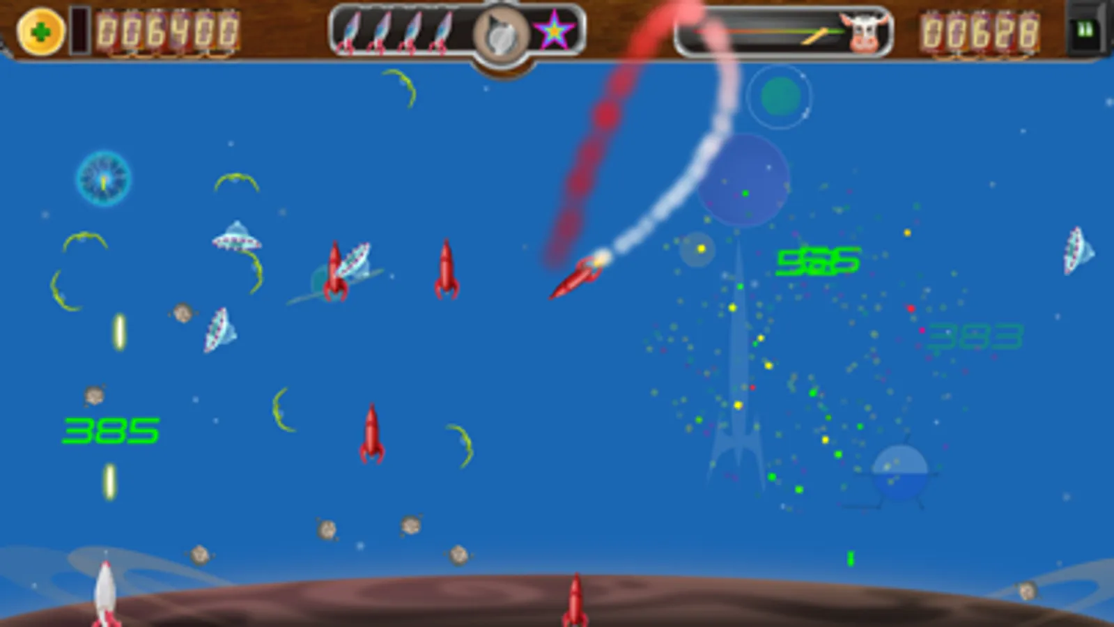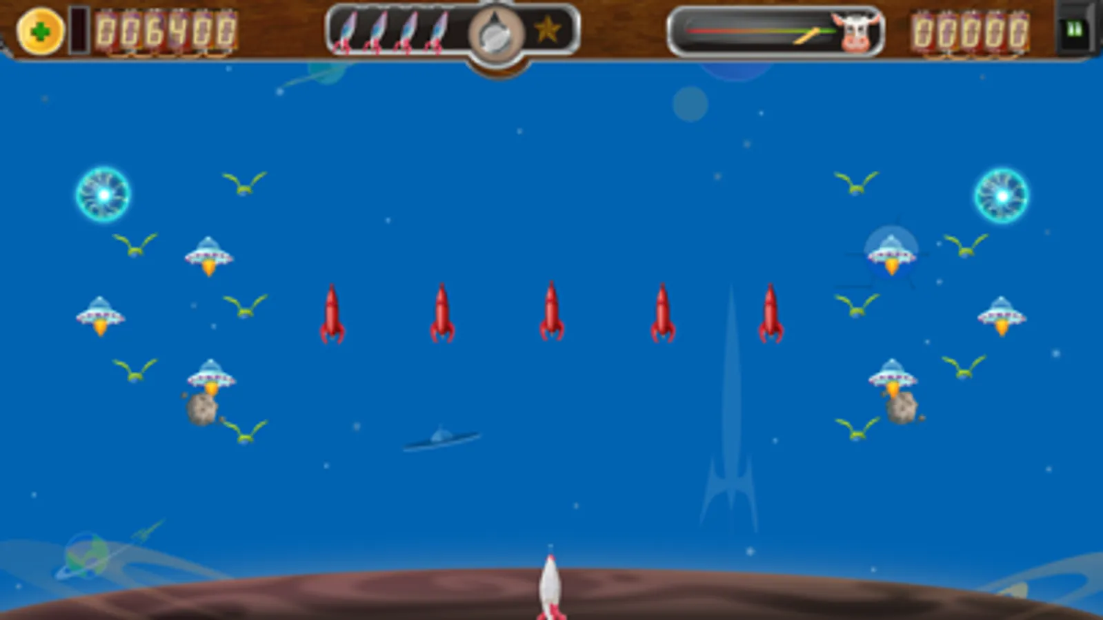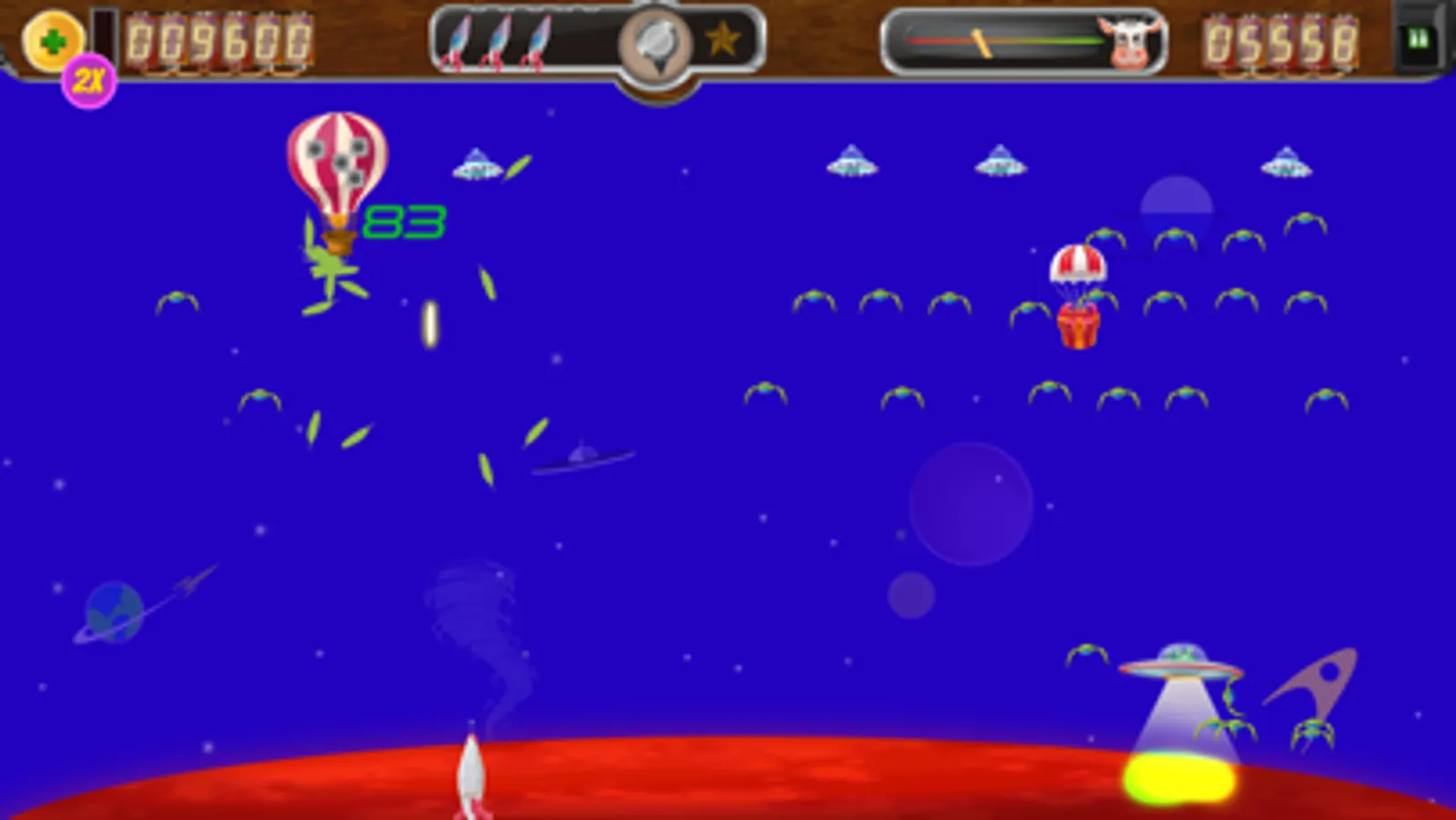 Use your AR5000 ship to visit each planet and save the cows, but be careful: These are not the aliens you have heard about. Their ships are more advanced and they move independently, dodge your bullets, and shoot back! You will need all your skills (and more) to defeat them.