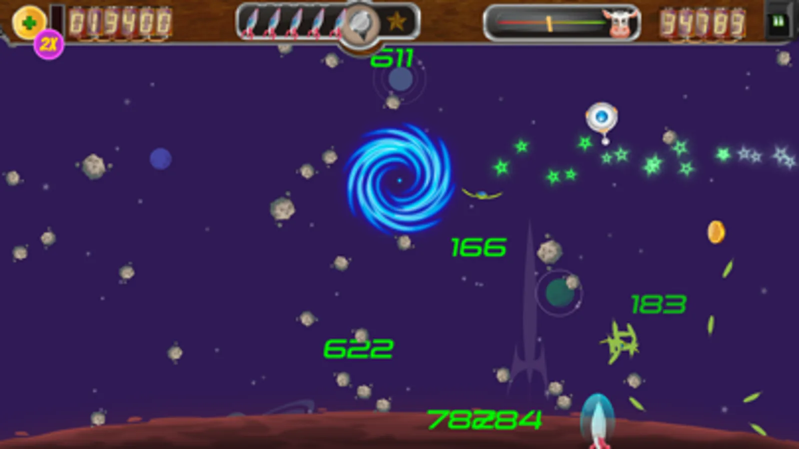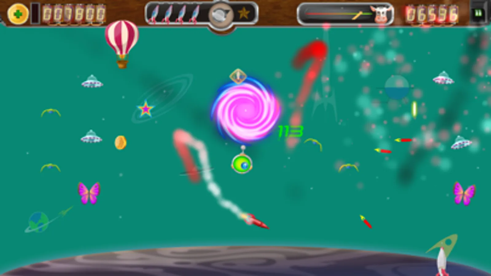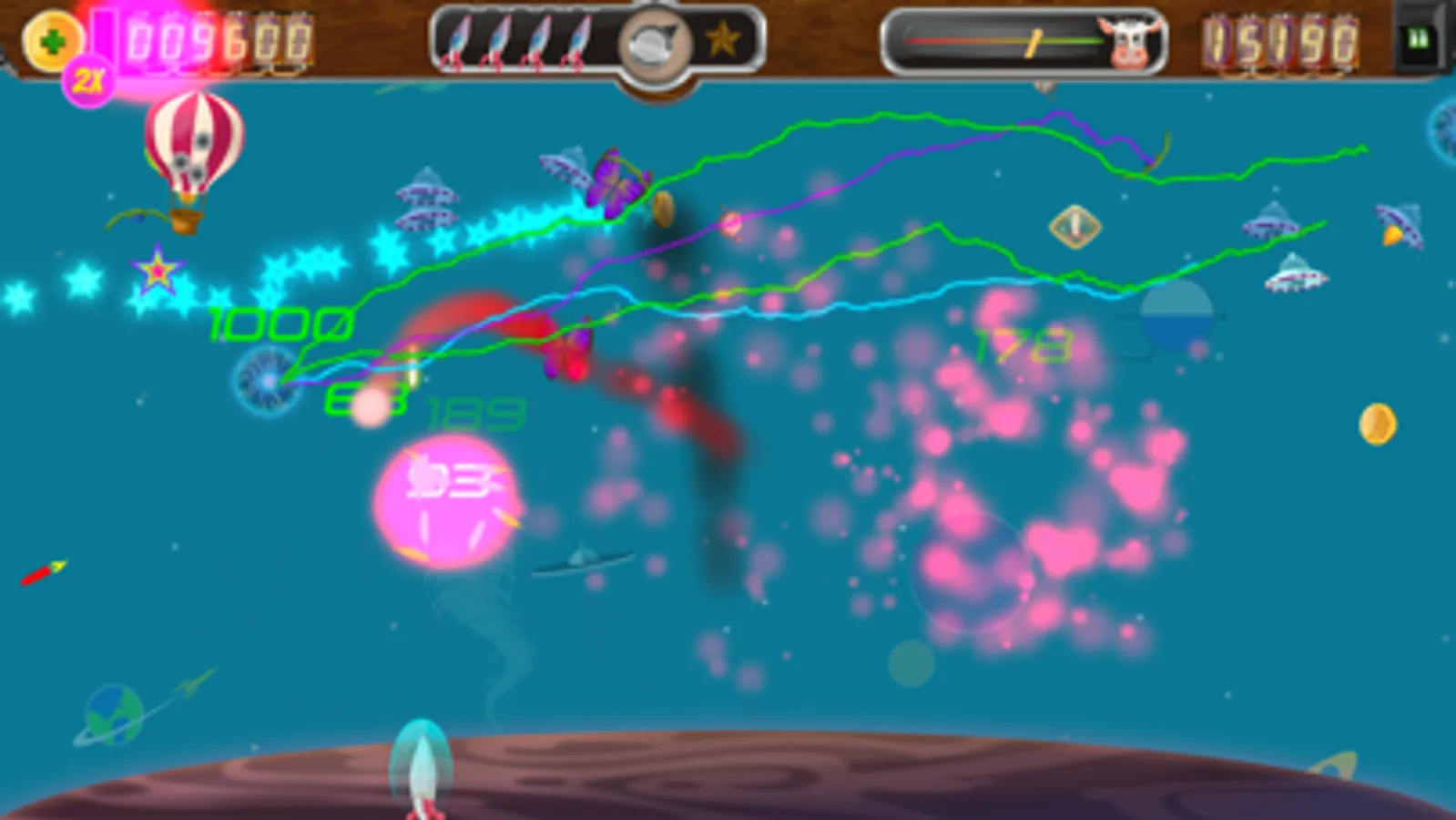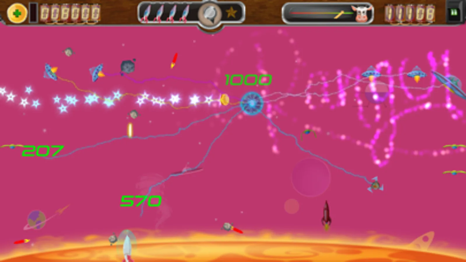 Use your AR5000 ship to visit each planet and save the cows, but be careful: These are not the aliens you have heard about. Their ships are more advanced and they move independently, dodge your bullets, and shoot back! You will need all your skills (and more) to defeat them.