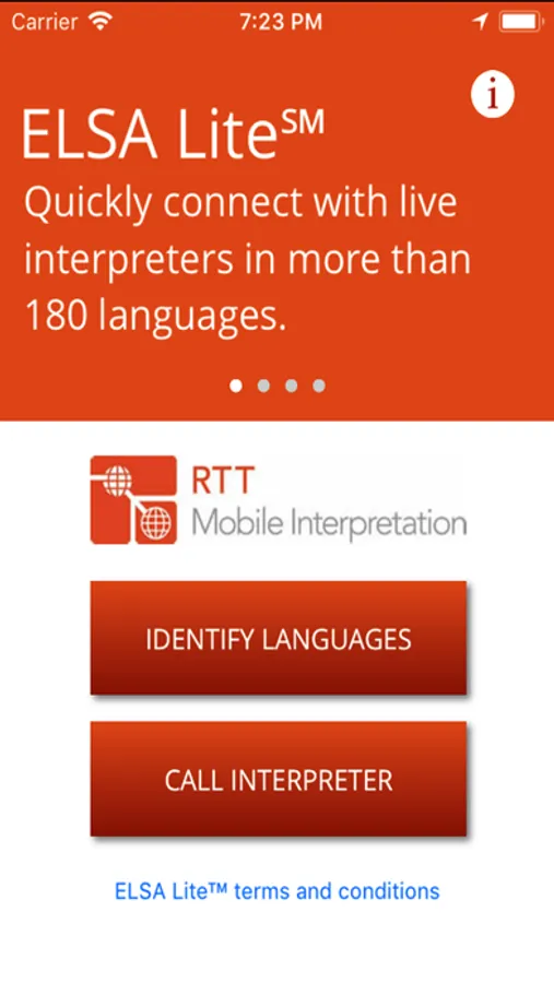 ELSA Lite is designed to help you quickly connect with an interpreter to help resolve any communication involving a person speaking a language other than English. Use the one-touch feature on ELSA Lite to connect to a live interpreter in any of more than 180 languages and dialects. ELSA Lite provides immediate access to a Spanish Hotline or to a call center where you can ask for any other language encountered. ELSA Lite provides users with two additional features that can be of great value when working with people who speak other languages. The first is an automated language ID system that enables you to show the person a list of languages presented in both English and the target language character set or script. Once the language is known, the user can immediately contact RTT Mobile and request an interpreter for that language. The second feature is a set of cultural communication tips that provides the user with useful information on any of more than 180 cultures. Scrolling through such information before engaging with members of a given culture will help make any contact more professional and productive. In order to use interpreter services