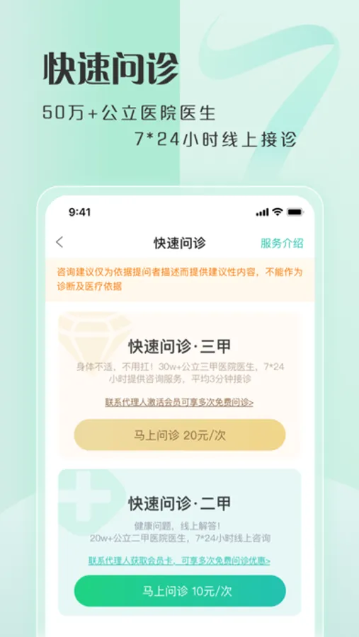 快速问诊——轻症小病线上快速问,图文、电话都支持,集合我国30多万名公立三甲医院医生,提供365天×24小时全年无休的健康咨询服务,时刻守护客户和家人的健康。