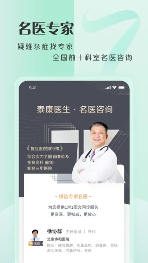 智能的健康记录、贴心的健康指导、便捷的专业问医、尊贵的重疾绿通,基于全国覆盖的医疗健康网络及医生集团,为客户提供全方位的健康守护,全面覆盖客户“健康时”、“小病时”、“大病时”、“康复时”的生命周期,为客户构建了一套完善的健康服务体系,泰康医生APP让您更健康、更长寿!