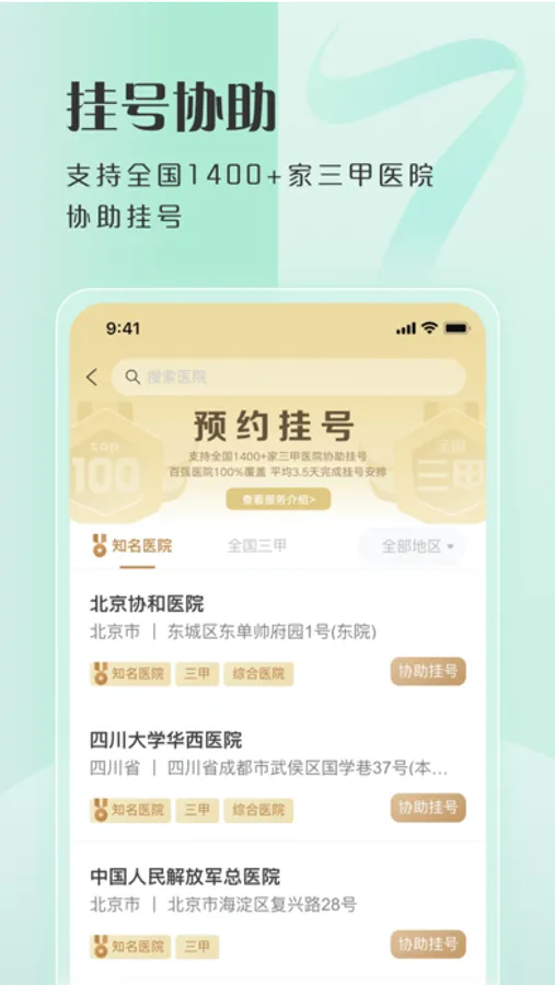 预约挂号——覆盖全国6600余家二级及以上公立医院,涵盖1400多家三甲医院,平均挂号时间为3.5天。