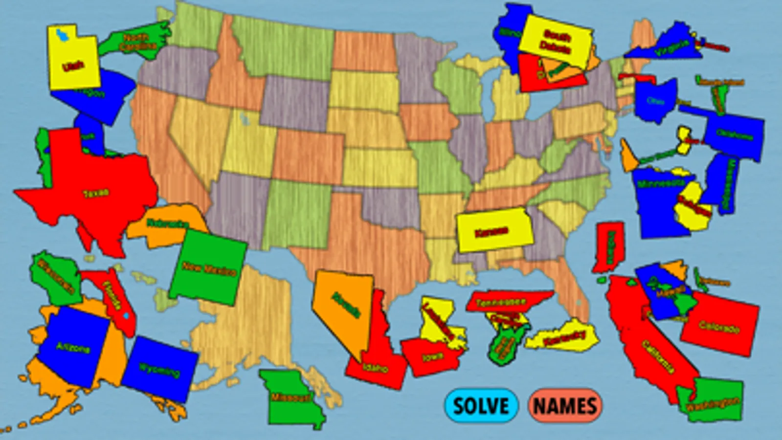 A solve button will place the states in their approximate location to assist a child having a difficult time finding the location.