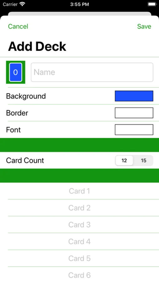 Custom decks allow you to create unique and fun cards. You can give each deck a different name. Select colors for the card background, border, and font. Choose between 12 and 15 cards. Choose whatever text or emoji you want for each card.