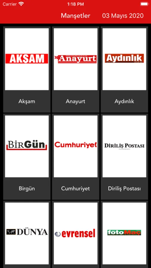Akşam,Birgün,Bugün, Cumhuriyet, Güneş, Habertürk, Hürriyet, Milli Gazete, Milliyet, Posta, Radikal, Sabah, Sözcü,Star,Takvim, Taraf, Türkiye, Vakit, Vatan, Yeni Asya, Yeni Şafak, Zaman, Fanatik, Fotomaç, Fotospor, Dünya,