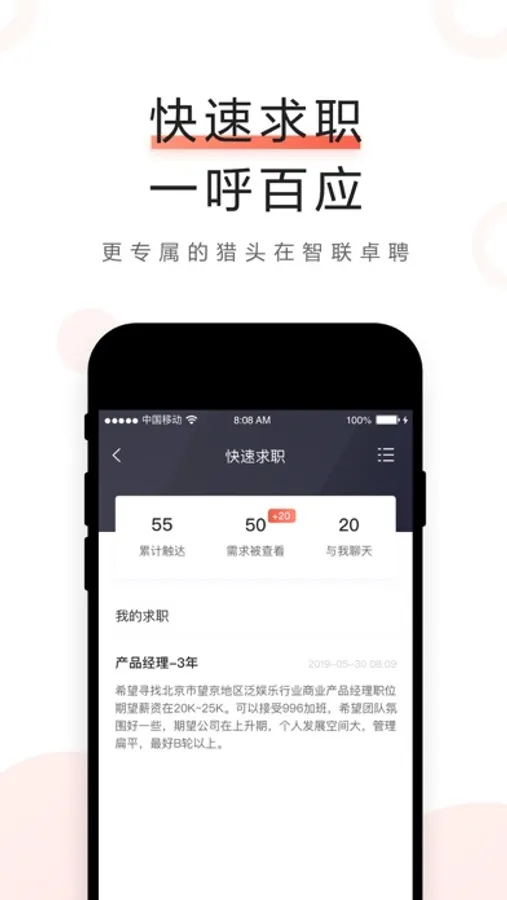 2.智能推荐:我们会在你最想跳槽的时候给你推荐适合的职位,你再也不用自己搜索职位了;
