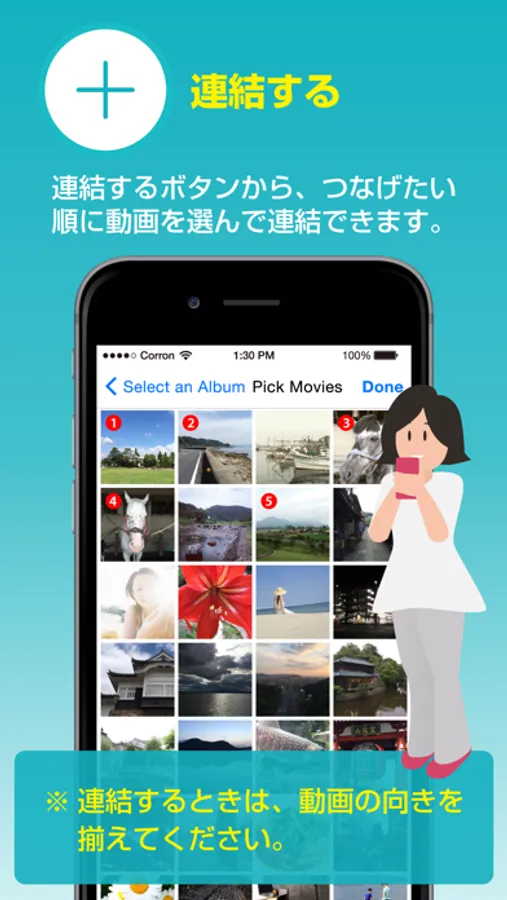 ③連結したい動画を順番にタップする。このとき、タップした順番に数字が付きます。(押し間違えた場合はその動画をもう一回タップすれば数字は消えます)