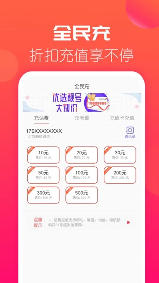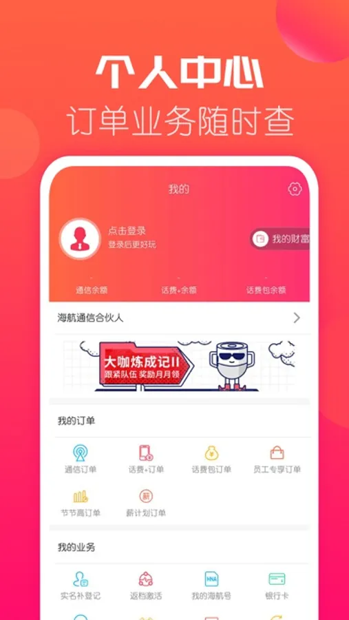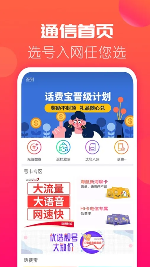 海航通信推出的移动客户端,可以实时掌握海航通信活动讯息。每日随时随地享受签到获取资源,在您方便查询资源余量的同时也可快速办理相关业务。提供全民充服务,支持移动、联通、电信充值话费流量,更有优惠活动领取丰富奖励。搭建白拿商城,体现话费升值的能量商城,提供存话费,送商品,到期话费全额退的新型话费白拿模式。