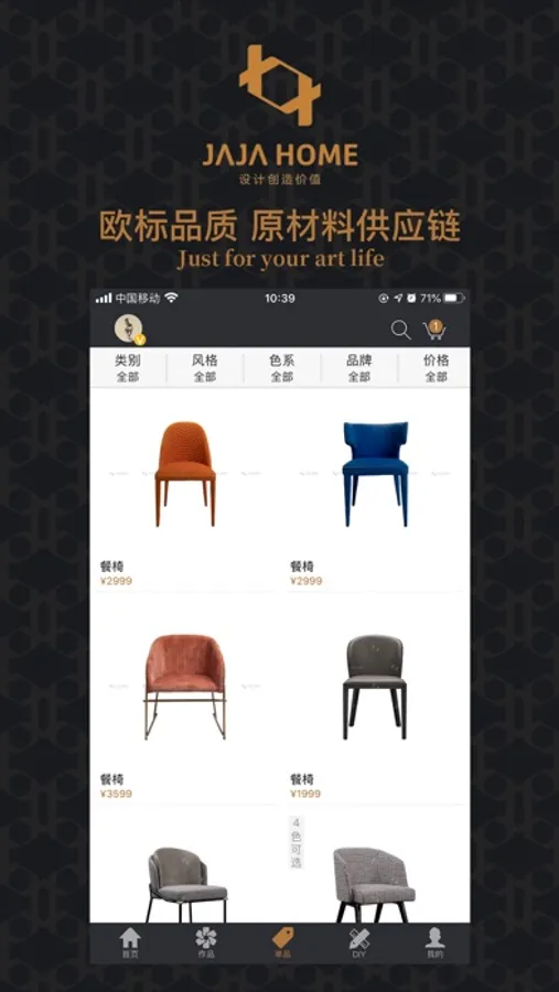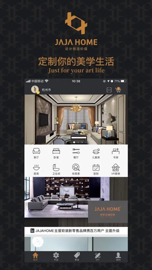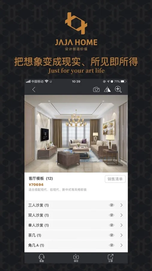 JAJAHOME为软装设计者量身开发了集“搜索+互动+设计+销售+成长”的强大APP工具系统,力求做最强大的软装设计创业“弹药库”。APP构建了一个“精品套装+万款单品+设计+ + 找我家+DIY等”的设计生态系统模块,客厅、卧室、书房、餐厅、儿童房等功能系统一一呈现,完成了从平面到沉浸式互动实景空间的升级,它是软装设计者的创作弹药库、门店销售员的订单神奇、厂家数据的云平台。构建了“互联网+软装设计”的一站式最佳解决方案。