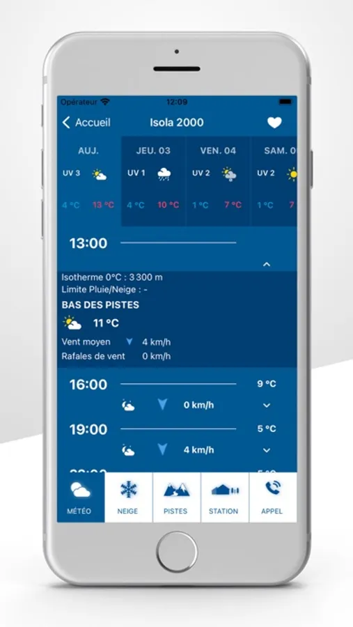 o Les températures minimales et maximales et le vent en bas et en haut des pistes, les rafales, les chutes de neige ou la pluie, ainsi que l'altitude de l'iso 0°C et de la limite pluie/neige pour chaque période.