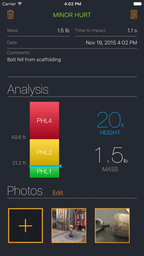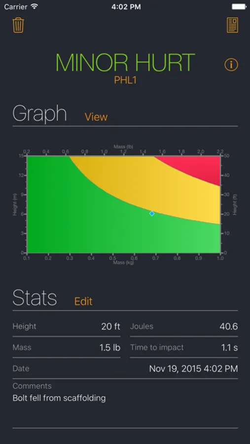 Drop Hurt Calc provides a simple way to estimate the potential hurt level (PHL) caused by a falling object based on the object’s mass and height. Use the app to capture details, pictures, and notes about the dropped object, visualize the PHL, and generate a detailed PDF report.