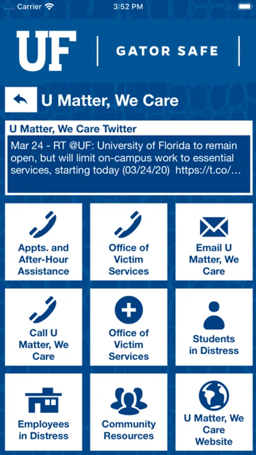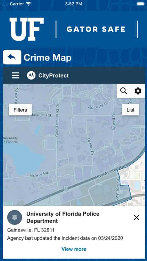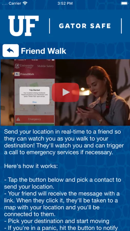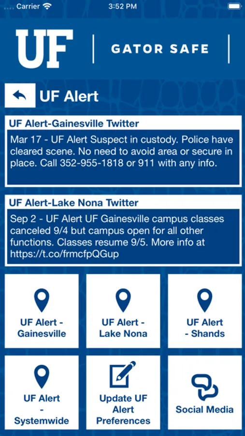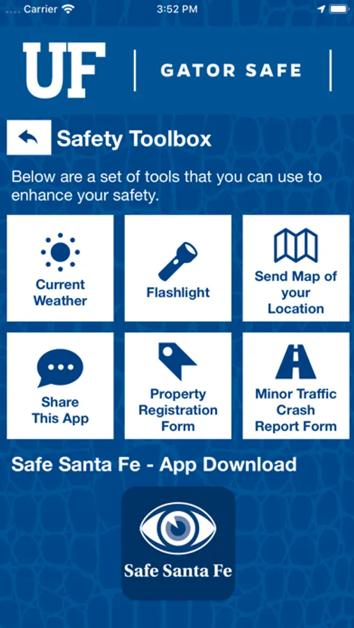 GATOR SAFE is the official safety app of University of Florida. The University of Florida Police Department has worked to develop a unique app that provides students, faculty and staff with added safety on the UF campus. The app will send you important safety alerts and provide instant access to campus safety resources.