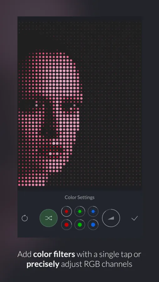 Define the color palette of your artwork and lose yourself in the interplay of shapes and colors. Generate standard or monochromatic color filters with a single tap or precisely adjust Red, Green and Blue channels. Modulate the intensity of the filter in order to find the dress that perfectly suits the character of your composition.