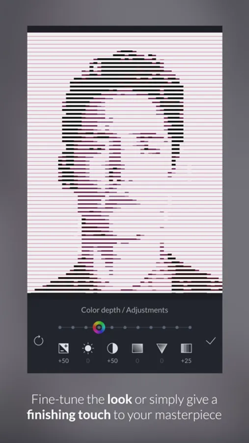 Fine-tune the appearance or simply add a finishing touch to your masterpiece. Reduce the color depth to redefine the style of your design (ideal for retro-game or glitchy looks) or apply standard adjustments such as exposure, brightness, contrast, saturation, vibrance and fade.