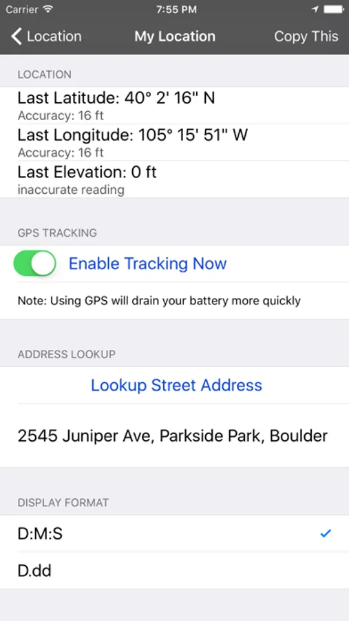 --My Location. Quickly snag your GPS coordinates and determine the street address at your location, and enter these into a run report.