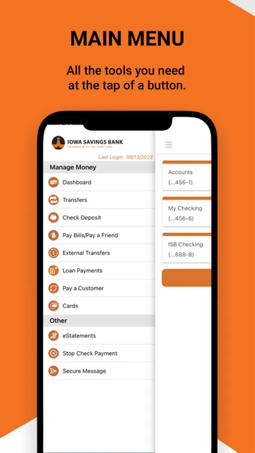 With Iowa Savings Bank Mobile Banking App you can safely and securely access your accounts anytime, anywhere. Our mobile app is FREE and allows you to: