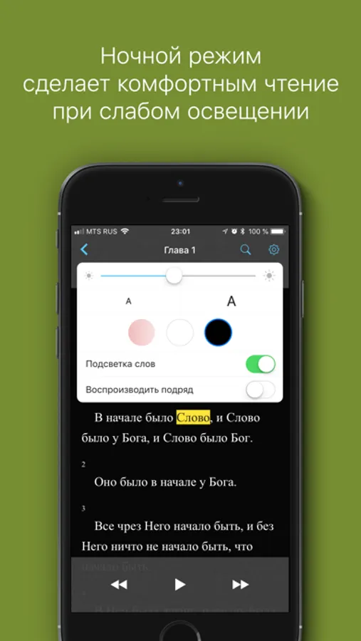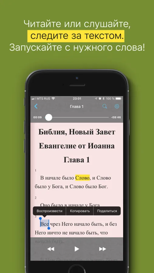 ・Воспроизведение с выбранного слова при помощи долгого касания;