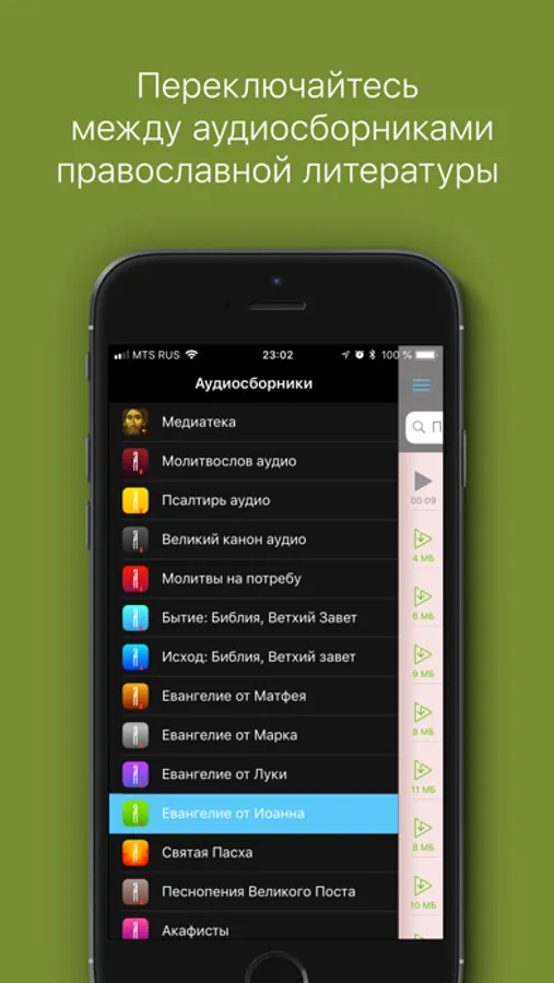 ・Легкое переключение между православными тематическими аудиосборниками через выпадающее меню;