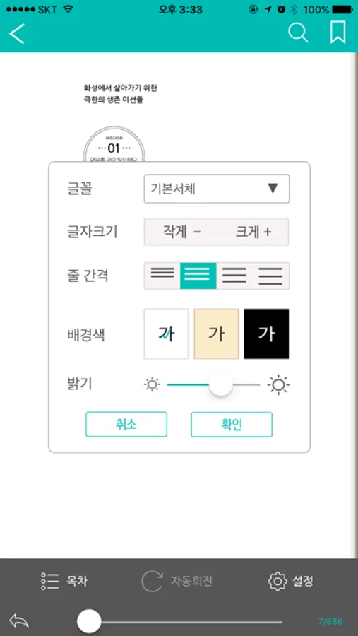 * 화면 밝기, 폰트, 글자 크기를 자유롭게 설정 가능