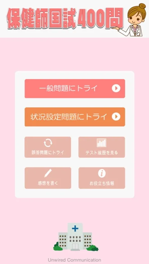 保健師国家試験の解説付き問題が全て無料で!保健師を目指すあなたの大きな味方です。「保健師国試400問」は、その名の通り、過去の国家試験で出題された約400問を収録したアプリです。もちろん、追加の有料問題や会員登録なども無く、全て無料です。基本はランダムで20問出題されますが、一般問題、状況設定問題ごとにトライすることも可能。更には、間違った問題のみ再トライできる機能や、試験結果の履歴保存、保健師向けの各種お役立ち情報も。さあ、あなたもこのアプリを使ってパブリックヘルスナースを目指して下さい!