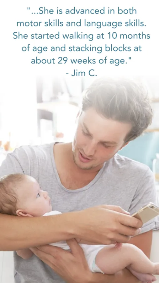 "I can say (and our pediatrician says) she is advanced in both motor skills and language skills. She started walking at 10 months of age and stacking blocks at about 29 weeks of age." - Jim C.