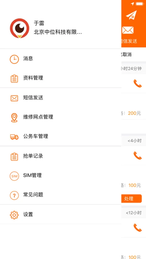 2、客服端功能:消息提醒、售后支持资料管理、维护网点管理、公务车管理、订单记录查询、SIM卡管理、常见问题、订单发起、订单分析/分配等功能。