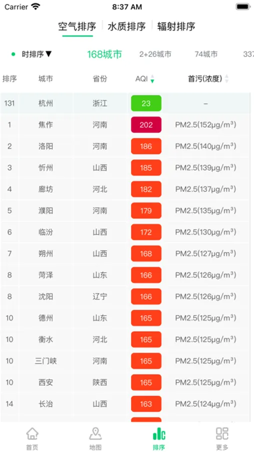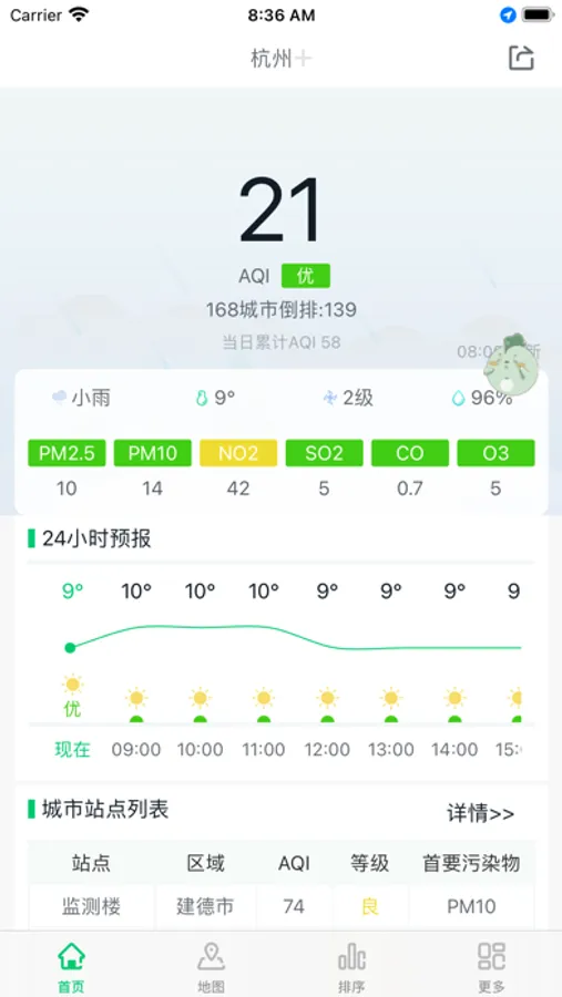 + 分析内容详细:其主要功能包括所选城市及站点的空气质量监测、污染地图、城市间不同时间维度的排名,一目了然。