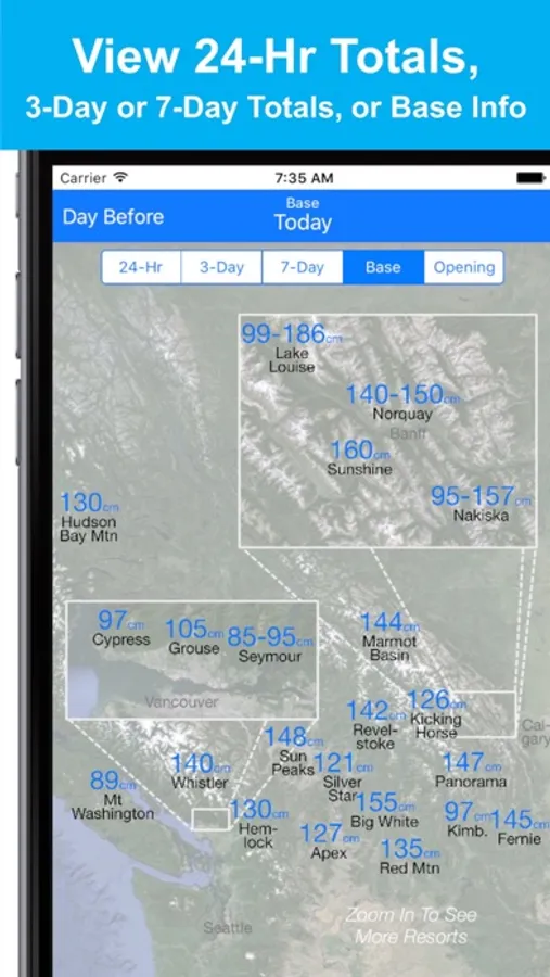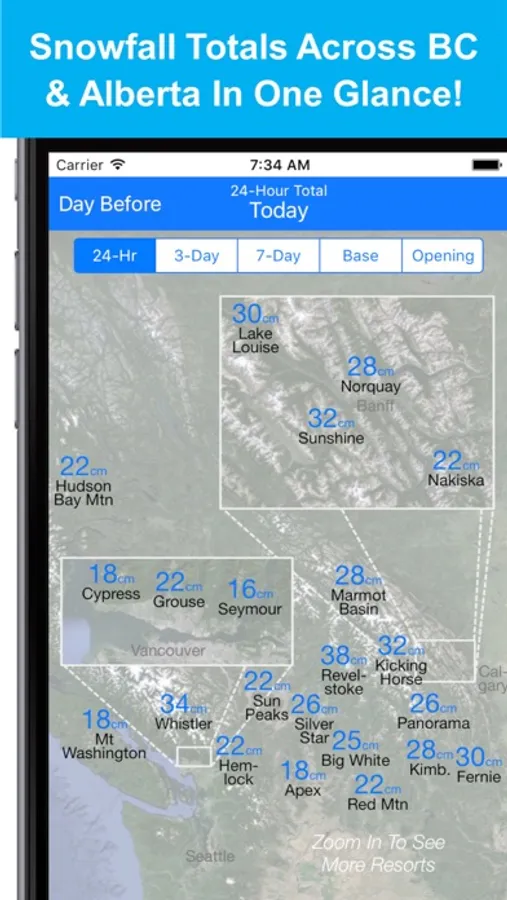- Zoom in to your favorite region of Western Canada to focus on the resorts you care most about. When you reopen the app, the Snow Map will take you right back to the region you were last viewing.