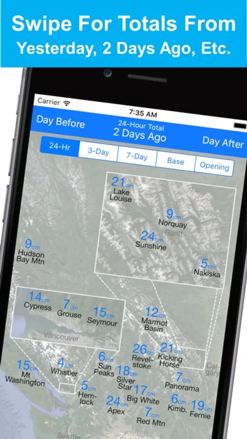 - See the same statistics for past dates by swiping left or right on the map. This lets you see how much snow each resort received yesterday, two days ago, etc.